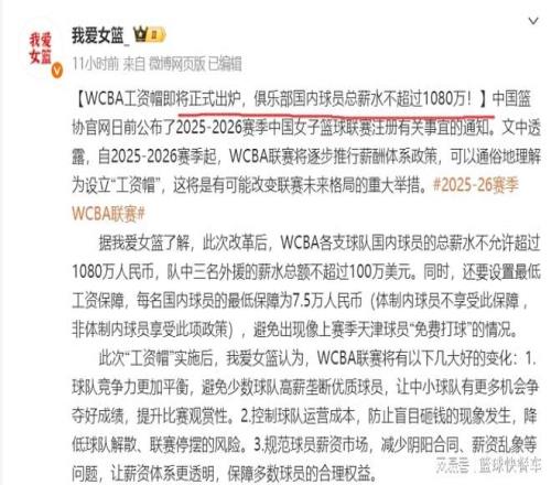 不过,随着新规的出炉,四川女篮这种大肆招兵买马的模式,已经彻底被断绝了。根据知情人士透露,WCBA联赛新赛季也将出台工资帽,根据规定,WCBA球队本土球员总薪资不能超过1080元,而外援总薪水不能超过100万美元。另外,为了照顾年轻球员,避免年轻球员因为薪水过低而放弃职业联赛,这一次他们还出台了最低薪水,最低不能低于7.5万元。