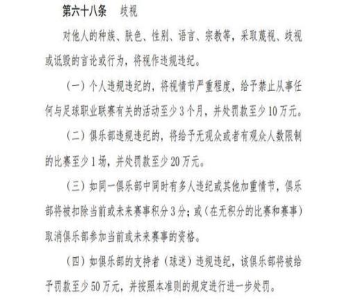在中足联今年发布的《中国足球职业联赛联合会纪律与道德准则(2025版)》中专门增加了有关“歧视”的条款,第六十八条明确规定,如果俱乐部球迷存在歧视言论或行为,该俱乐部将被罚款至少50万。