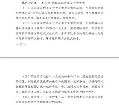 同时在第八十八条还规定,无论球迷的不当行为是有意还是疏忽,赛区及主队俱乐部都要对球迷的不当行为负责,并可以根据实际情况进行处罚,其中不当行为便包括叫喊侮辱性口号。视频中所在的球迷看台,应该就是主队看台。因此,一旦中足联介入调查并坐实,成都蓉城恐怕难逃罚单。