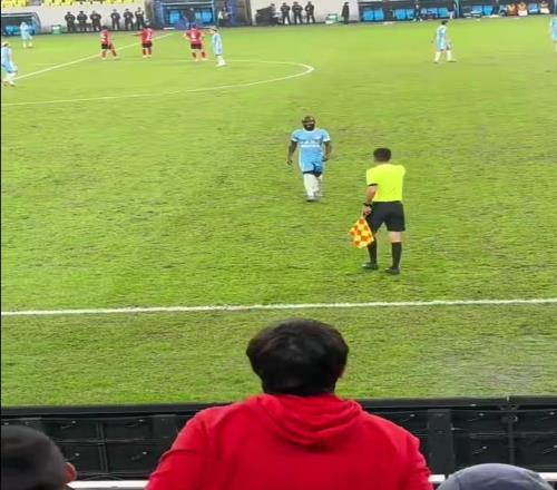 这一幕应该发生在比赛进行到第60分钟左右,当时成都蓉城外援古尔芬克尔受伤被换下,德尔加多刚刚登场,阿奇姆彭便被看台上球迷的歧视行为激怒,他情绪非常激动地向主裁判艾堃抗议,导致比赛一度中断。
